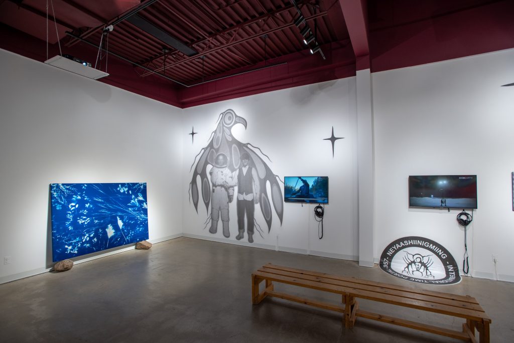 The Future is Ancestral exhibition at the Godfrey Dean Art Gallery is curated by Melanie Monique Rose with the support of Advisor Kokum Brenda Dubois and Artistic Director Doreen Girard. The artists are Torrie Ironstar, Robyn Adams, Rhikee Strapp aka Miskwa the Mad Clown Prophet and the Time Travel Collective – Nyle Miigizi Johnston, Virginia Eichhorn and Joel Richardson.