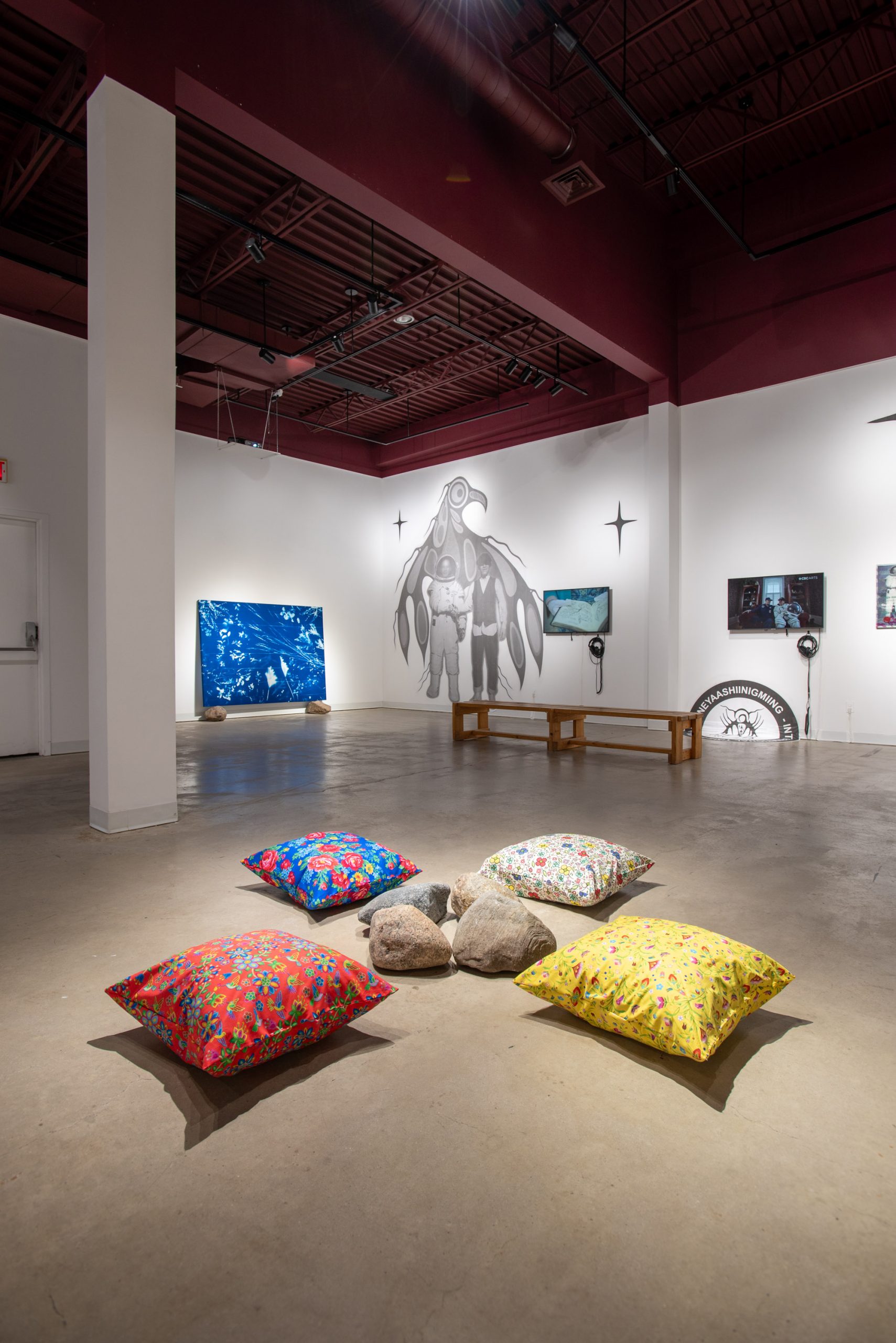 Indigenous folks tend to agree that time is not linear. Perhaps it looks like a wave hitting the shoreline, leaving and returning…? Does time look like a sunflower, a fiddlehead or a pinecone — or the curls in your hair? Spiralling, whorling and looping like the fingerprints on our hands? Storytelling is how we make sense and relate to time, to the present, past and future. The Future is Ancestral is a gathering of visual storytellers, storykeepers, portal builders and truth seekers. Some of these artists ask, “If we haven’t gone through truth yet, how can we have reconciliation?” They pull out stories and strings, undo and weave, unravel myths, false and pseudo histories. They relate to the past and consult the Elders to understand the present, to imagine futures. Like water in its nonlinear temporality, it is at once ancestral and present in the here and now. “Rivers, those beings that have always inhabited different worlds, are the ones that suggest to me that if there is a future to imagine, it is also ancestral, since it’s already present.” Ailton Krenak, Ancestral Future